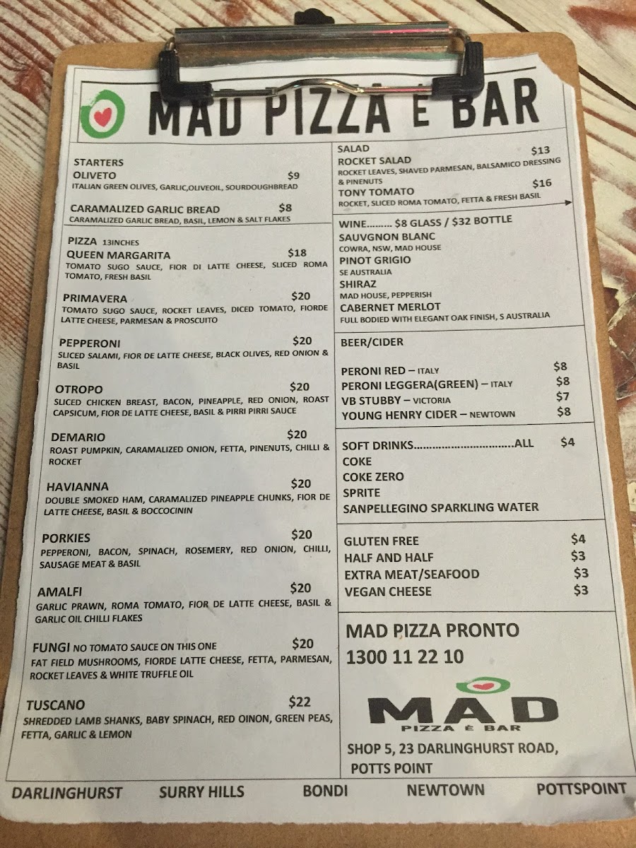 Whether you're a pizza connoisseur or a casual diner, this menu promises to satisfy your cravings with authentic flavors and a dash of creativity. Come experience the culinary delights that make Mad Pizza E Bar Potts Point Pronto a must-visit!